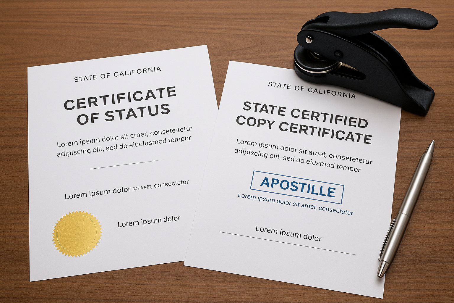 A Certificate of Status or State Certified Copy Certificate from the California Secretary of State is an official document confirming that a business entity is properly registered and in good standing with the state. It verifies the company’s legal existence and compliance with state requirements, such as filing obligations and fee payments. A Certified Copy Certificate confirms that a specific document (like Articles of Incorporation or an Amendment) on file with the Secretary of State is a true and complete reproduction of the original. These documents are often required for use in legal, financial, or international matters, including obtaining an apostille.